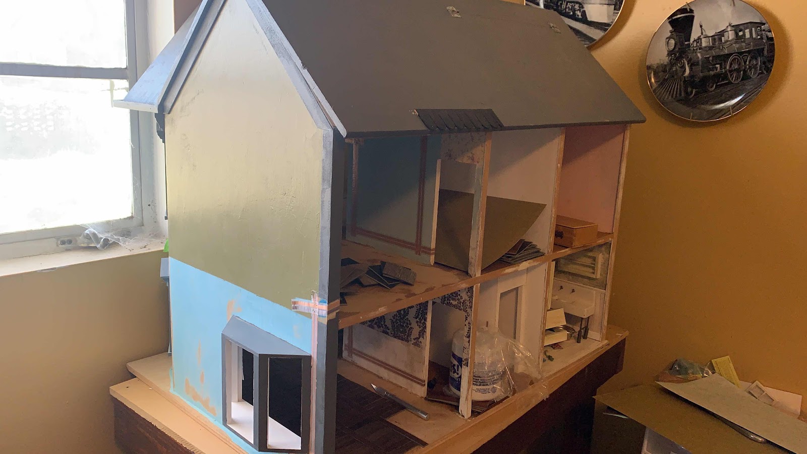 Since my last post about the dollhouse, I have gotten quite a bit accomplished. The floor is done downstairs and part of upstairs. New decisions made as to windows and doors, wallpaper, paint, furniture. My main stumbling block right now is I don’t have the money for supplies. So that means doing what I can with what I have until I can but what I need. So here is a photo dump of the past month and a half